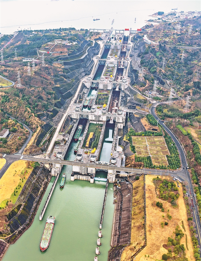 2月21日,三峡北线船闸进行检修施工(无人机照片)。