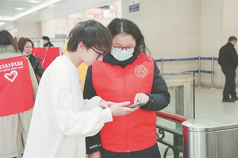 东北农业大学志愿者在哈尔滨火车站为旅客提供服务。