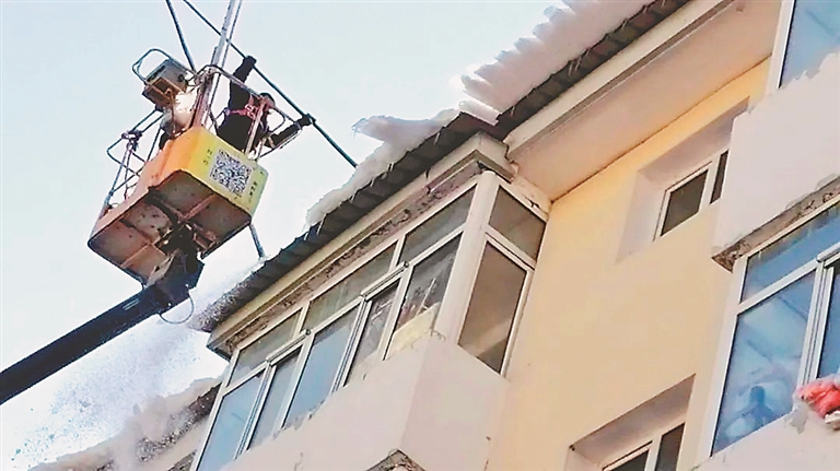 海林林业局有限公司物业工作人员采取人工和机械设备结合的方式对屋顶的悬冰和积雪进行清理。同时,在老楼区、通道狭窄的地段设立警戒牌,拉起警戒线,提示居民和车辆远离,全力做好居民群众日常生活保障服务。