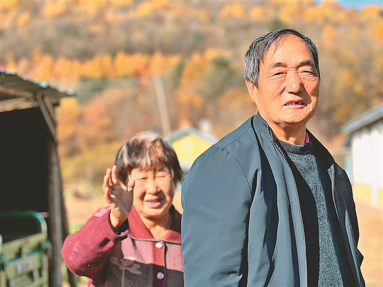 70岁的蒲保顺坐在小屋前的石头上,举着手机,眯着眼睛,不知什么精彩节目吸引了他,脸上始终是笑呵呵的。他身前的小菜地,一棵棵壮壮实实的秋白菜长势喜人,金黄金黄的玉米棒子正铺开晾晒着,几只溜达鸡脖子一顿一顿在他脚边啄食……