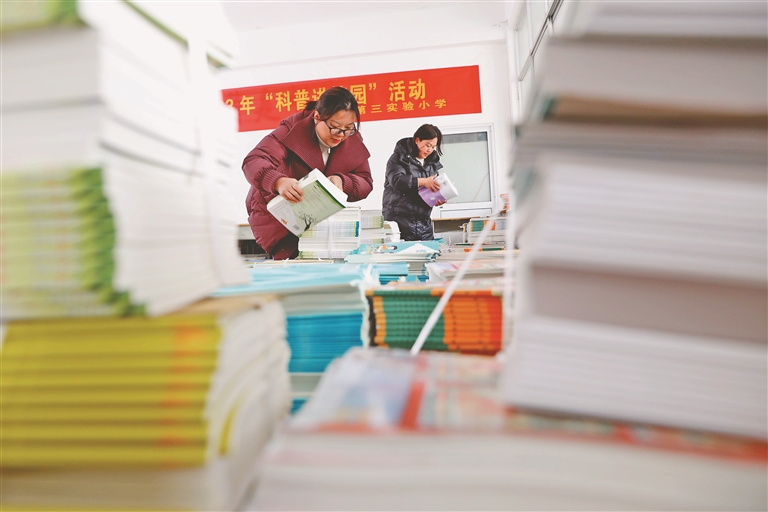 2月22日,河南省焦作市温县第三实验小学教师在整理、分发教材。
