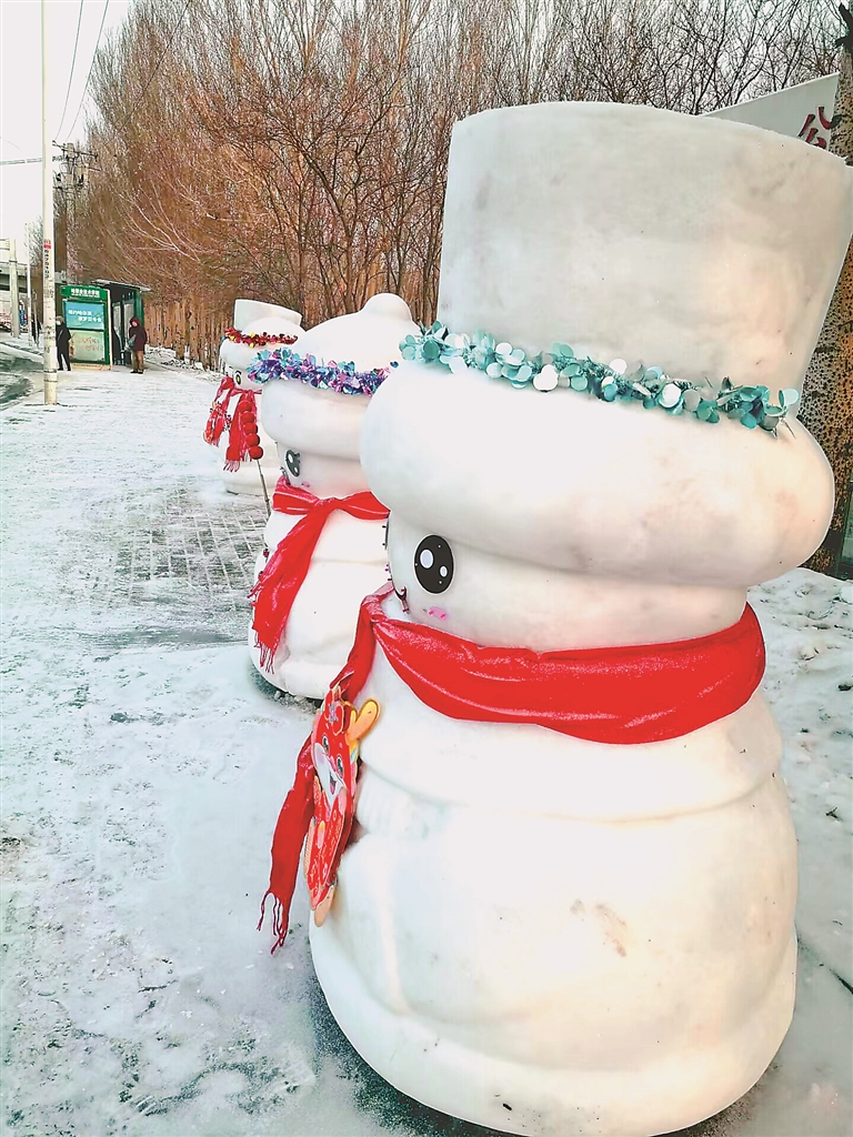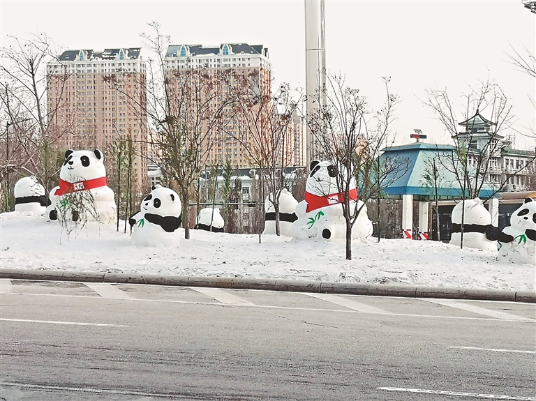 哈尔滨火车站附近街路边憨态可掬的大熊猫造型雪雕群。