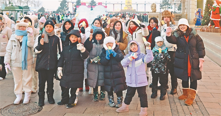 游客拿着马迭尔冰棍打卡哈尔滨。本报记者 张澍摄