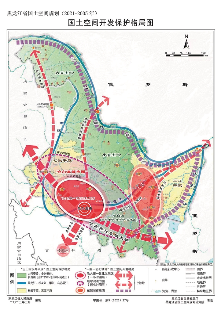 “七轴带”,即哈长区域协同发展带、哈大齐牡发展主轴、哈绥北黑发展轴、哈佳同抚发展轴、齐加漠发展轴、抚双牡发展轴、沿边城镇带,是全省国土空间开发的主要轴带,以及参与以国内大循环为主体、国内国际双循环相互促进的新发展格局的重要开放通道。