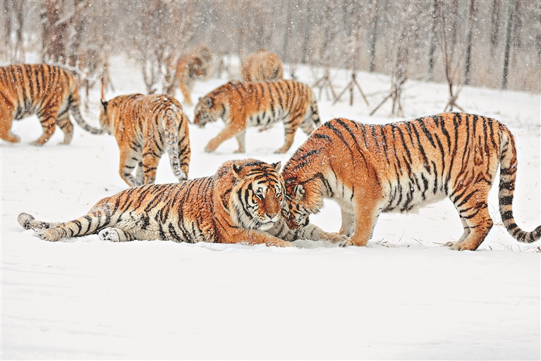 在这里,游客们可以乘坐惊险观光车,观赏东北虎雪地打滚、求爱争斗的欢乐场面,也可以为东北虎投喂食物,近距离感受虎口大张的霸气。