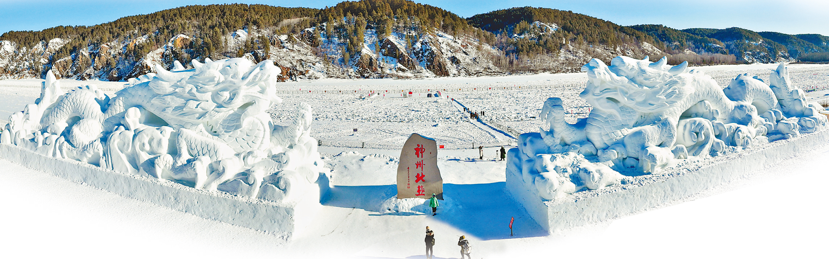 漠河市北极村飞龙乘云的雪塑大气磅礴。本报记者 张澍摄