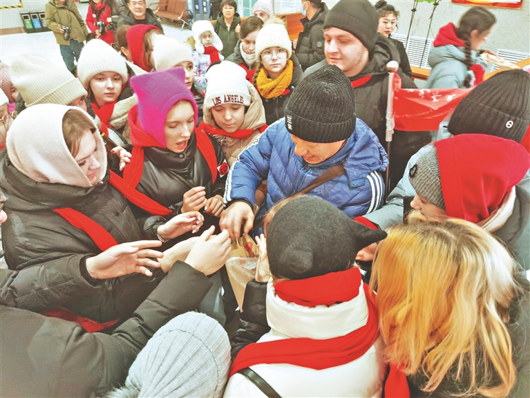 市民陈凤春带来糖葫芦请俄罗斯小朋友品尝。