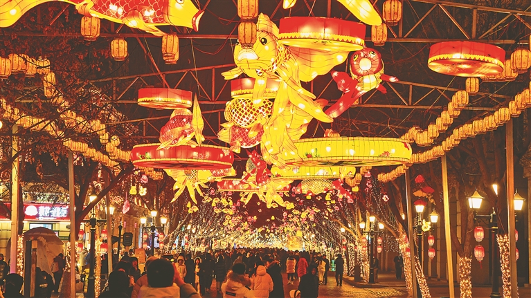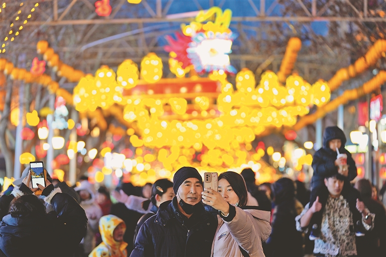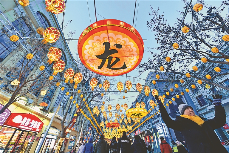 哈尔滨|2月24日,在哈尔滨中央大街,游客在龙灯前留影。新华社记者 王建威摄