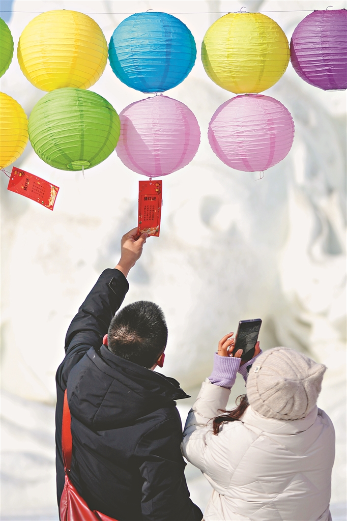 2月24日,游客在哈尔滨太阳岛雪博会园区内猜灯谜。新华社记者 王建威摄