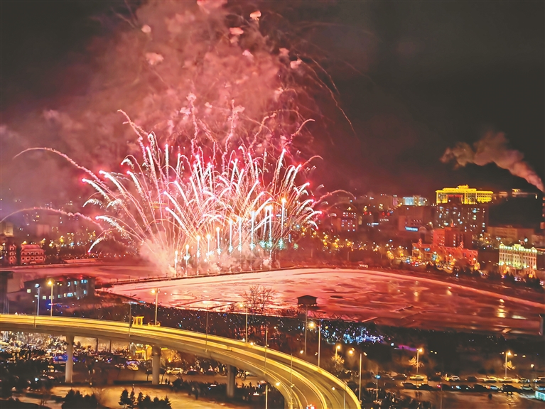 绥芬河|元宵夜的日月湖畔,焰火璀璨、人流如潮。2月24日晚,绥芬河市元宵节焰火晚会在北海公园日月湖举行。19时30分,焰火晚会正式开始。焰火映红张张笑脸,烟花照亮百年口岸,璀璨绚烂的烟花与小城的夜景、群众的欢声笑语交相辉映。市民们欣赏绚丽的焰火,感受喜庆的节日气氛。本报记者 杜怀宇摄