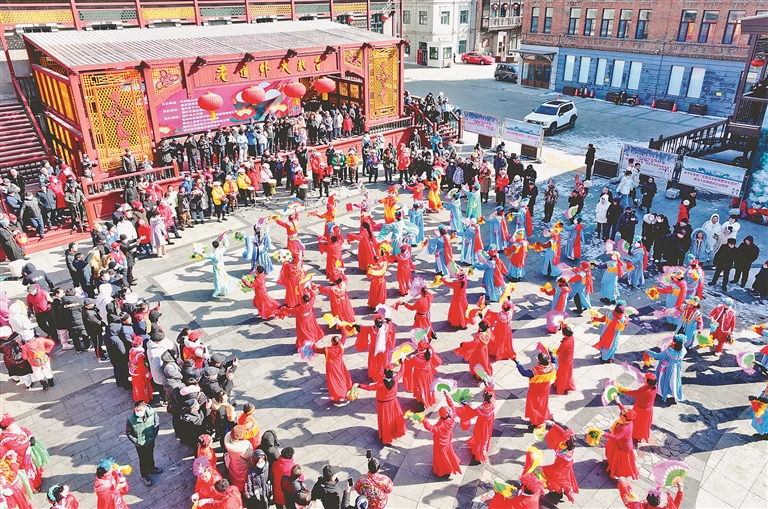 2月24日,哈尔滨市道外巴洛克街区热闹非凡,多支秧歌队在大舞台广场轮番登场,欢快舞蹈。现场人员为游客和市民免费送汤圆、免费送剪纸,吸引市民、游客驻足欣赏、品尝。本报记者 张澍摄