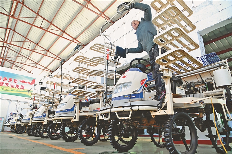 在军犁管理区,工作人员正对插秧机设备进行检修。此次检修的重点主要集中在导航设备供电运行以及设备版本情况。副主任宋其海介绍,为了确保后续春耕的质量,工作人员对新购入的农机设备进行记录,并结合设备型号,向种植户推荐了新型的侧深施肥、导航等设备。