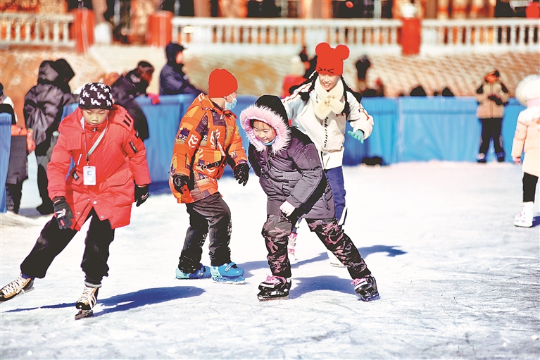 26日,哈尔滨市南岗区儿童公园冰场内,许多中小学生在练习滑冰,欢声笑语、其乐无穷。