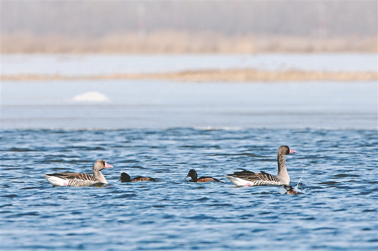 近日,在齐齐哈尔市泰来县泰湖湿地国家公园,大面积水域开始融化,国家一级重点保护野生动物东方白鹳、青头潜鸭相继飞到泰湖水域栖息,数量众多的苍鹭、灰雁、绿头鸭、绿翅鸭、骨顶鸡等野生动物争相亮相。