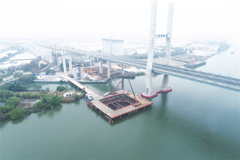中国铁建大桥局承担深江铁路11标正线全长23.72千米,桥梁占比100%。此次施工的跨磨刀门水道主桥为本项目的控制性工程,主跨320米,跨越I级航道,是目前为止世界上首例采用钢桁架-部分包覆混凝土组合梁形式的斜拉桥。