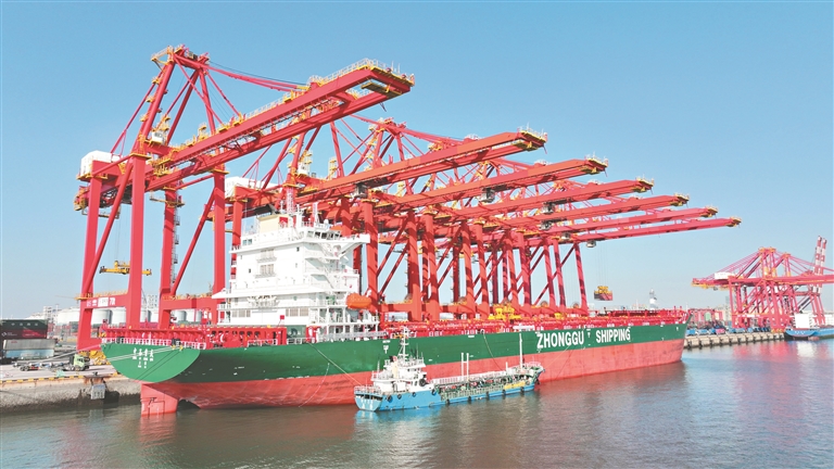 在山东港口日照港,货轮停泊集装箱码头装卸作业。 国家统计局18日发布的数据显示,今年前2个月,生产需求稳中有升,就业物价总体稳定,发展质量不断改善,经济运行延续回升向好态势,起步平稳。新华社记者 郭绪雷摄