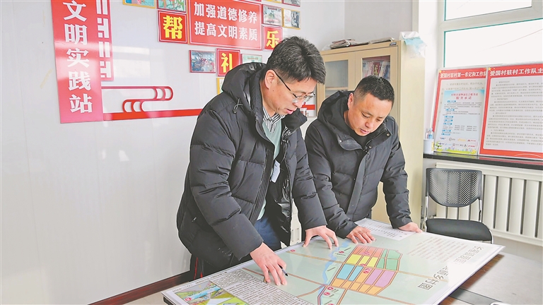 长福镇党委副书记徐彬(左)与爱国村驻村第一书记曹晓冬(右)谋划新年发展方向。