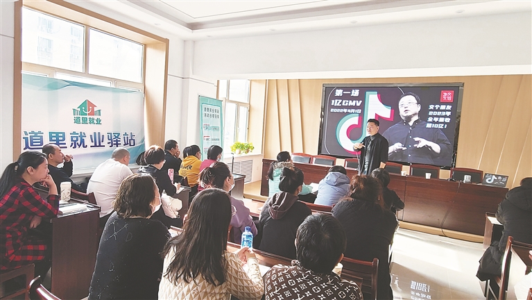 就业驿站二楼,一堂电商直播培训课正在火热进行。“我是做实体店铺经营的,想尝试一下直播带货,但不知如何起步。这堂培训课打开了我的思路,让我对电商直播有了基本的了解,受益匪浅。”上完培训课,居民吴瑞石打开了视野。