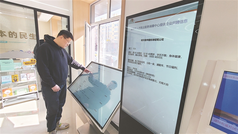 走进设立在道里区建国街道办事处党群服务中心内的道里就业驿站,门口右侧放置的两台显示屏格外醒目。其中,一台显示屏可以登录“哈尔滨就业地图”网站查询招聘信息,另一台显示屏上则滚动播放着招聘信息。在专属服务区域,有居民正在咨询职业技能培训事宜。“由多名人社局干部和民营企业的HR、职业培训机构专业人员组成兼职服务队伍,每周一至周五,固定在这里开展就业创业政策咨询、个人求职登记、岗位信息发布、职业指导、职业技能培训、劳动人事争议调解六方面公益性就业服务。”道里区人社局就业创业科负责人姜海说。