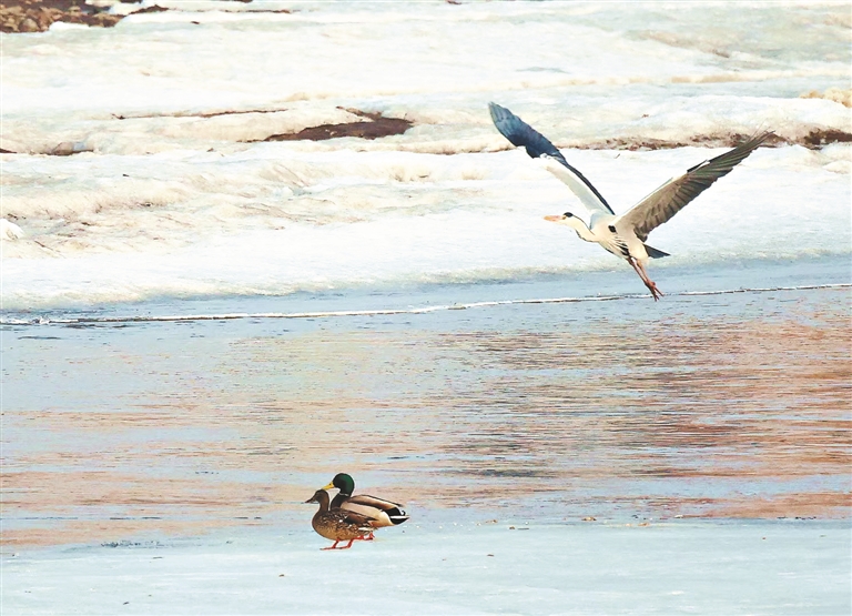 鸟儿在融化的江面嬉戏。朱绍翎摄
