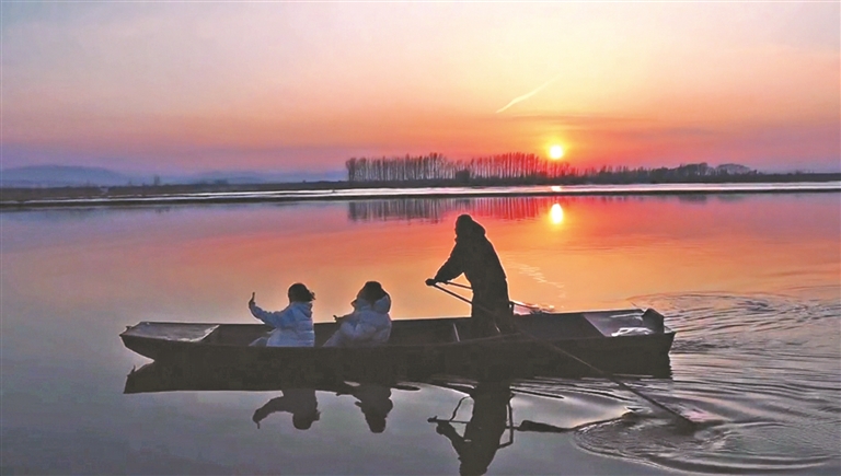 在牡丹江宁安段,夕阳下大雁飞过。江面上开化的部分,平静的江水折射着夕阳波光粼粼;未开化的地方还有少许冰面和积雪,白雪与黑水交错,画面静谧而美好。在宁安市拐弯村,江面上有渔船来回划过,市民坐在渔船上用手机记录下大雁、夕阳的美景。