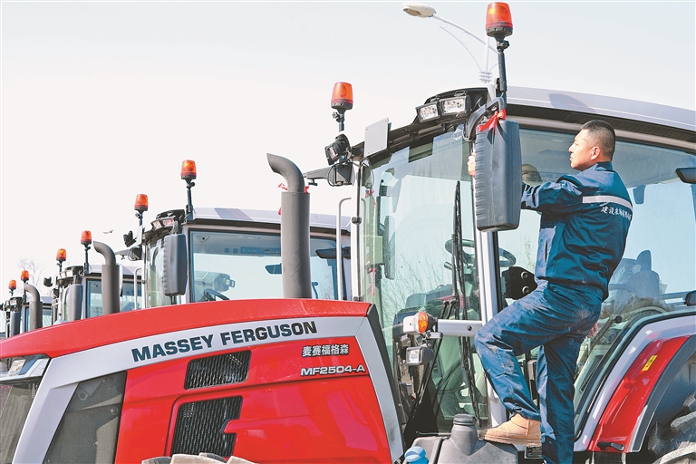 3月22日,在北大荒集团建设农场有限公司,农机手对新引进的拖拉机进行调试。