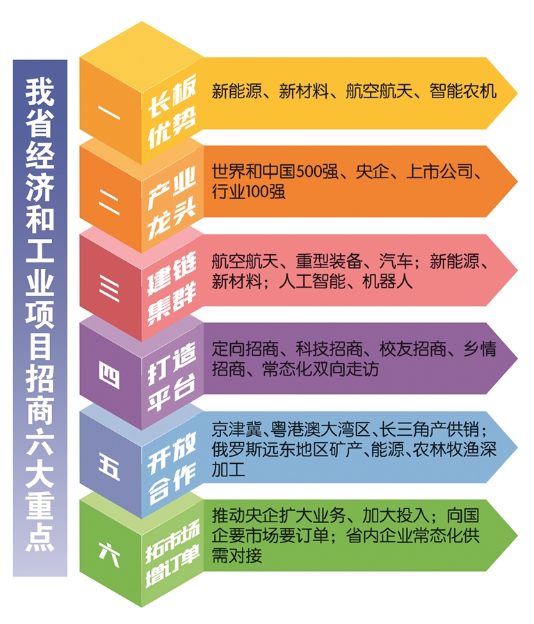 聚焦建链集群精准招商。围绕重点产业补链、延链、强链和集群发展,发挥航空航天、重型装备、汽车等领域既有龙头企业引领带动作用,吸引更多上下游省外企业落户龙江;依托新能源、新材料等领域骨干企业,强化原料、零部件、技术等方面合作协同,推动一批配套协作项目落地;强化人工智能、机器人等优势领域技术、场景、政策等方面的支撑和供给,组合生成和培育壮大一批新产业新技术新模式企业。