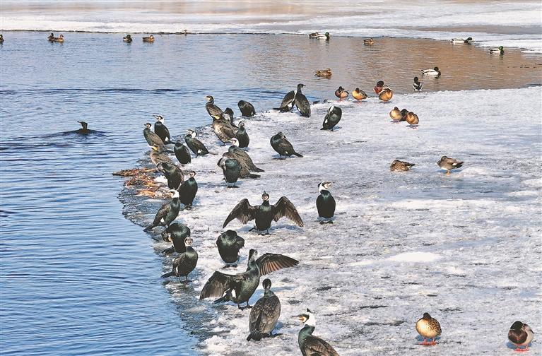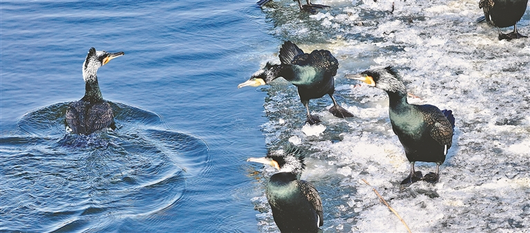 近日,在松花江哈尔滨城区段一处正在融化的江面上,大群北归的候鸟中出现上百只鸬鹚。它们或是站在冰面上休息,或是在水中觅食、打闹。