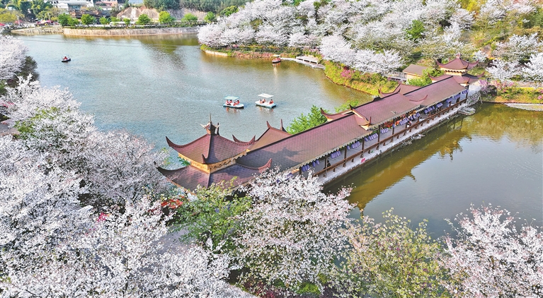 3月24日,游人在泸州市江阳区丹林镇建设村“樱花谷”泛舟赏樱。
