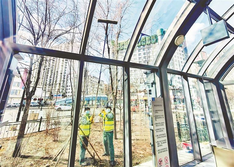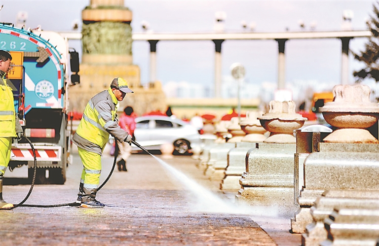 近日,哈尔滨市各区环卫部门利用中午气温较高时段,对公共设施开展清洗,对街路进行湿扫作业,解决冰雪融化造成街路尘土量大、废弃物多等问题,提高路面洁净度,使城区环境卫生质量得到明显改善和提升。本报记者 苏强摄