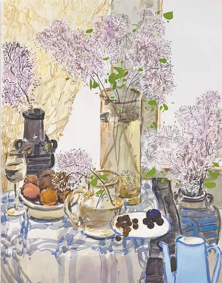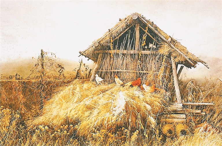 如赵云龙的作品《秋韵》,通过细腻、丰富的笔法描绘了温馨、恬静的田园生活,展现了水彩画艺术与现实生活的密切联系。画面色彩清新、明快,质感丰富、写实。柴火堆的干燥、坚硬;母鸡羽毛的柔软、蓬松;天空与地面的金黄色调……都使画面中的景物鲜活、灵动,呼之欲出,将黑龙江乡村的秋日展现得淋漓尽致而又不失艺术美感,是地域风格作品的典型。赵云龙的《五月丁香》系列作品,以哈尔滨市花——丁香花入画,用高超的造型语言展现丁香淡雅的色彩以及繁茂的形态,营造出“乱花渐欲迷人眼”的视觉效果,仿佛能感受到丁香花的芳香扑鼻,地域风格特色浓郁。还有孟宪德的《味象澄怀·咏秋》系列作品,以浓丽的色彩和干练的笔触描绘出北方的秋日田野,用诗歌般的艺术语言赞叹着耕耘的收获和自然的美妙,创造出宁静而又祥和的画面效果,折射出艺术家对人文观念与自然精神的思索。
