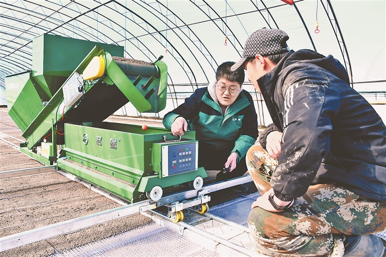 3月26日,在北大荒农业股份八五六分公司种植户吕向民家的育秧大棚内,电动播种机、覆土机来回穿梭作业,掀起了水稻播种热潮。