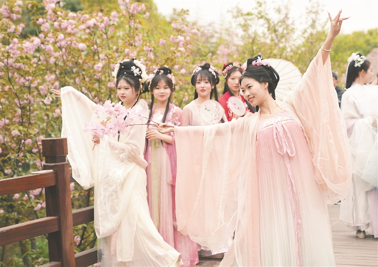 当日,浙江省丽水市莲都区古堰画乡景区,10多名汉服爱好者在樱花栈道上进行汉服表演,吸引游客打卡拍照。