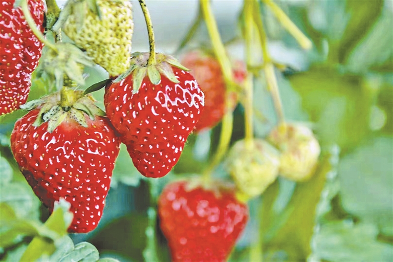 细心的游客发现草莓中间立着一个蜜蜂箱,每当棚内温度升高时,蜂箱里的数十只蜜蜂就会飞出来采集花粉。草莓采摘大棚负责人汤吉国告诉记者:“蜜蜂给草莓授粉能使草莓的果实变大、颜色鲜艳、口感香甜,产量也能提高。今年春节期间草莓卖得特别好,每天采摘量在300斤到500斤之间,日销售额可达5000元至8000元。”