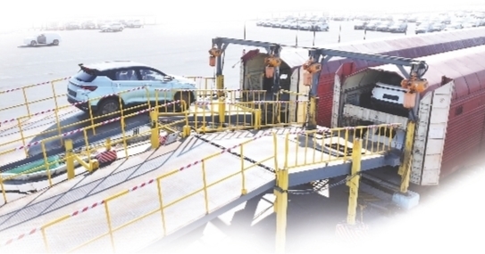 ①商品汽车装车。②JSQ全封闭车厢。③黑龙江首列JSQ型商品车中欧班列启程。