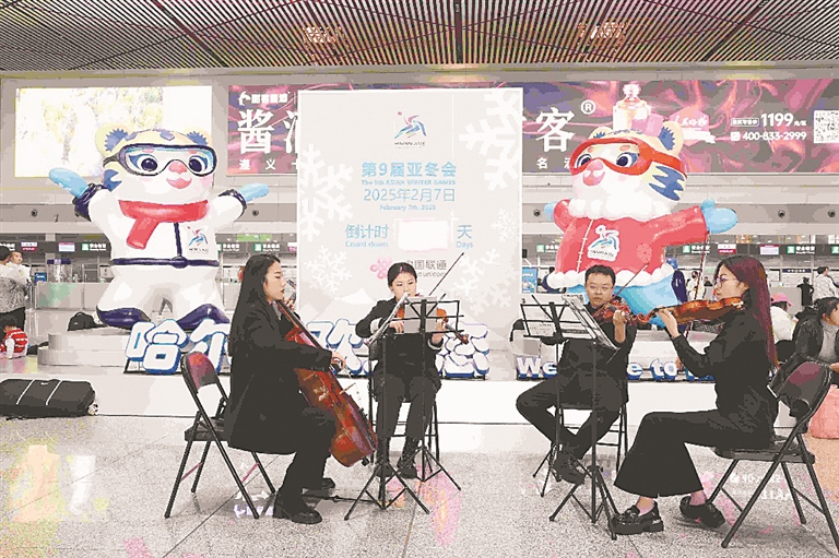 本报12日讯(刘烨 记者王迪)12日下午,在哈尔滨太平国际机场T2航站楼值机大厅,一场以“冰雪同梦、亚洲同心“为主题弦乐演奏正式拉开亚冬会倒计时300天演出活动的帷幕,小提琴和大提琴的美妙旋律交相呼应,吸引了众多旅客驻足欣赏。