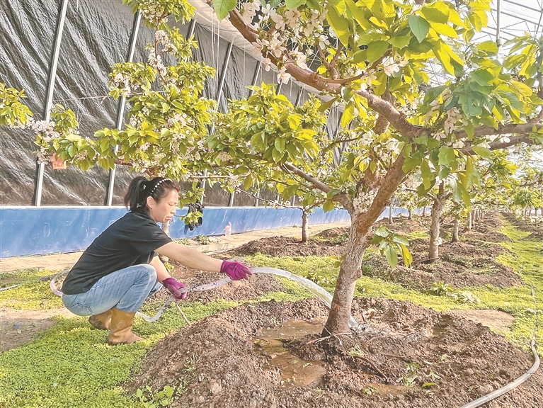 在汤旺朝鲜族乡金星村的樱桃大棚里,沁人心脾的花香扑鼻而来,一簇簇樱桃花缀满枝头、竞相绽放。工人们正在树木间来回穿梭,有序地进行摘花、授粉、防治病虫害等果园管理工作,确保今年的大棚樱桃丰产丰收。