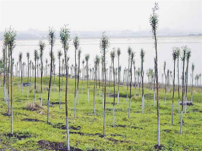 桃山水库北岸坡地上栽种的树苗。