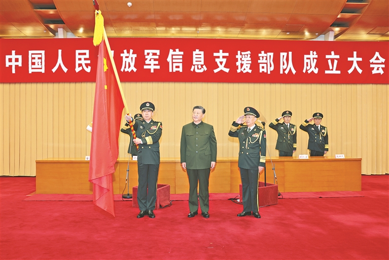新华社北京4月19日电(记者梅常伟)中国人民解放军信息支援部队成立大会19日在北京八一大楼隆重举行。中共中央总书记、国家主席、中央军委主席习近平向信息支援部队授予军旗并致训词,代表党中央和中央军委向信息支援部队全体官兵致以热烈祝贺。他强调,要贯彻新时代强军思想,贯彻新时代军事战略方针,坚持政治建军、改革强军、科技强军、人才强军、依法治军,聚焦备战打仗,按照体系融合、全域支撑的战略要求,锐意进取,扎实工作,努力建设一支强大的现代化信息支援部队。