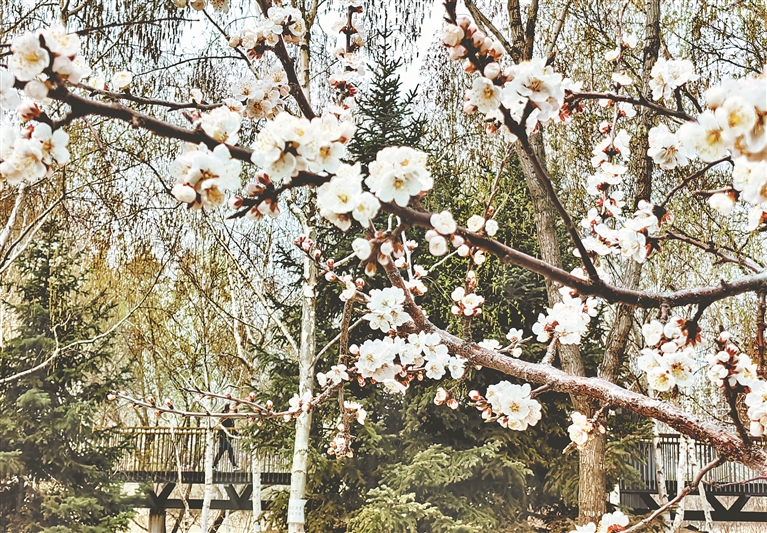 在湿地外侧,美丽的桃花、杏花次第开放,吸引着人们驻足观赏。