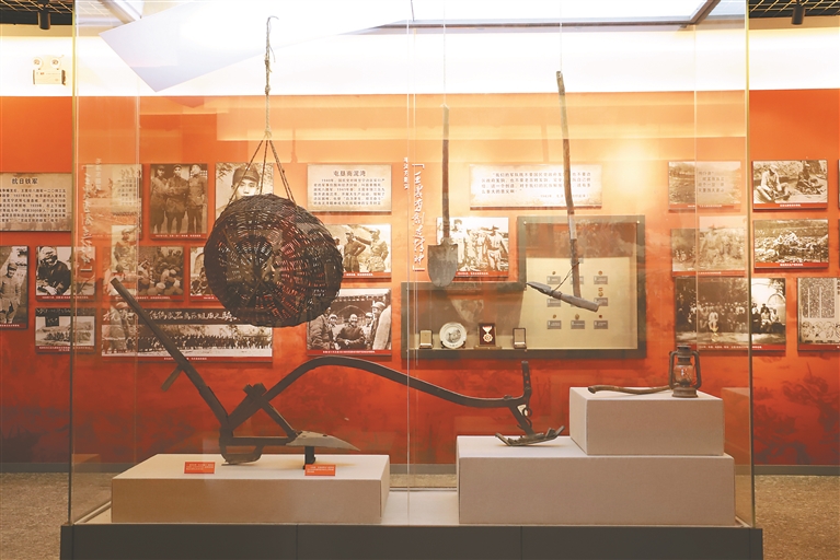 在展厅一角,用彩色雕塑还原了1958年建设云山水库的劳动场景。1958年3月,根据王震将军的指示,经勘测,决定在位于完达山西麓七虎林河上游兴建中型水库,以八五〇农场为主建单位,集中4000余名转业官兵和职工组成施工大军。当年6月,王震将军再次来水库工地看望转业官兵,检查施工质量和进度,并与战士们一起抬筐填土、同吃同住同劳动。展馆中至今陈列着王震当年与战士挑土用的抬筐,它也是“奋斗200天建设云山水库”艰苦奋斗历程的参与者、见证者。