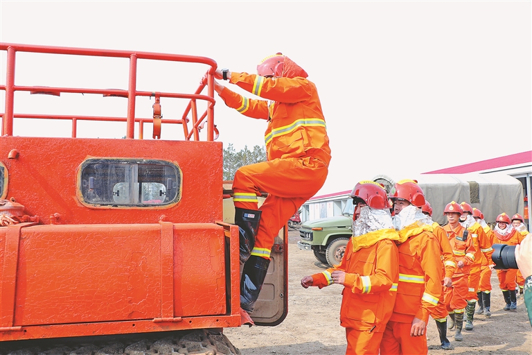 图①扑火人员和车辆整装待发。