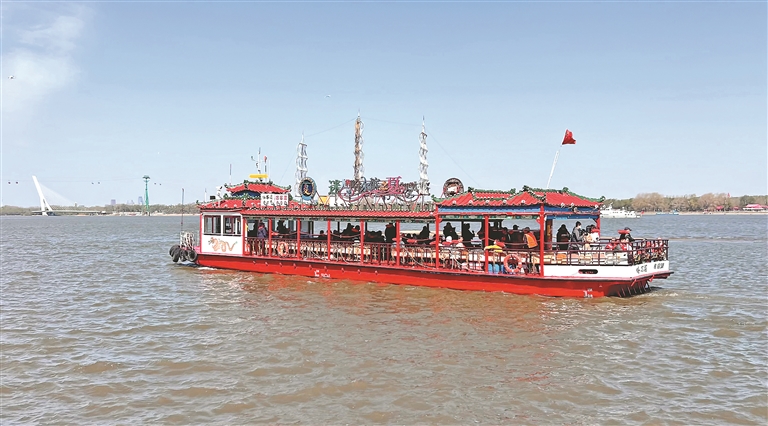 4月26日8时58分,哈尔滨市松花江畔,随着“一长三短”的离泊声号的响起,哈尔滨市顺航江上客运有限公司“哈渡客009”轮载着60余人从防洪纪念塔码头驶向太阳岛码头,标志着沉寂一冬的松花江客船迎来今年首航。