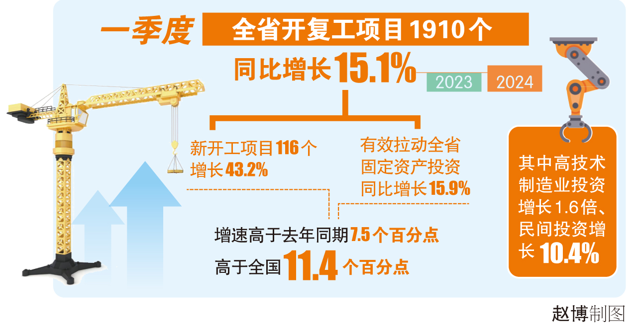本报讯(记者杨惠暄)日前,记者从省发展和改革委了解到,一季度全省上下坚持以高质量投资推动高质量发展,抓项目开工复工满工、抓投资结构调整、抓重点项目建设,全省开复工项目1910个,同比增长15.1%,其中新开工项目116个,增长43.2%,有效拉动全省固定资产投资同比增长15.9%,增速高于去年同期7.5个百分点,高于全国11.4个百分点,其中高技术制造业投资增长1.6倍、民间投资增长10.4%。