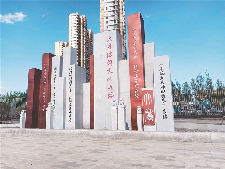 随着黎明河碧波荡漾,我起伏的思绪又来到滨州湖畔的诗词文化长廊。绿道两旁,有大庆油田开发初期的历史图片,更有第一列原油外运、输油管线、井架、抽油机等具有鲜明城市印记的雕塑,每一处景观都散发着钢铁的光泽和石油的芬芳。诗词呢?就更多了,既有党和国家领导人的题词和赞美大庆油田的诗词,也有铁人王进喜“宁可少活二十年,拼命也要拿下大油田”的铮铮誓言。站在绿道,我浮想联翩,70多年了,这在荒原上建起的城市,既有“中国人使用洋油的时代已经一去不复返了”的豪迈宣言,更有建设“百年油田、智慧油田、绿色油田”的崭新画卷。