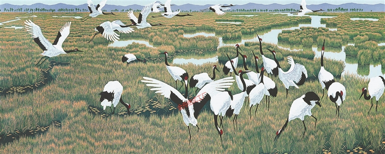 《天地同春 鹤舞丰泽》 版画 147×56cm 杨渝光