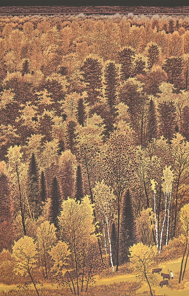 杨渝光作品中的山水意象就来自他的故乡记忆与情怀。他的家乡位于小兴安岭余脉丘陵地带的农场,群山怀抱,溪水萦绕。也许是告别了青春更怀念青春,离开了家乡更怀念家乡,与伙伴涉水放牛,看渔人荡舟水面,这些带有深刻记忆的图像反复出现于画面。杨渝光在捕捉客观物象的基础上,经过加工、改造和重组,形成自己的主观话语。他笔下的大荒物象,其形态来自生动鲜活的大自然,经过抽象提炼,高度概括,又与客观自然的真实面貌拉开距离,是画家自身独特的感受;其表现既是一种艺术符号,又是画家发自内心的情语。“予与山川神遇而迹化”,杨渝光把自己的审美理想以山水景物为依托表现出来,营造内心深处的意向世界。