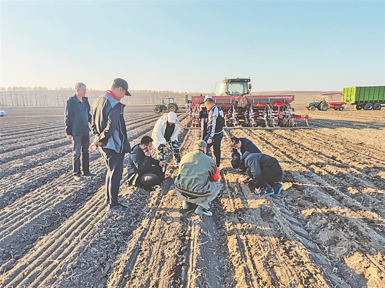 北大荒集团赵光农场被誉为共和国第一个国营机械农场,首任场长周光亚也是省农科院的建院“元老”。5月1日,省农科院玉米研究所组建的玉米科技服务团追随前辈的脚步,赶赴赵光农场,就玉米单产提升及大面积增产关键技术改良、高质量播种施肥技术进行了现场交流、培训和指导。服务团参加了农场的整地、施肥和播种工作,并为农场种植户就起垄形状、施肥量和播种密度进行了现场培训和指导,讲解了“实时墒情定播期”“区域积温选品种”和“株型-营养增密度”等播种工作技术要点,切实保障了播种工作的高质量完成,为农场2024年春玉米生产打下了坚实的基础和良好的开端。