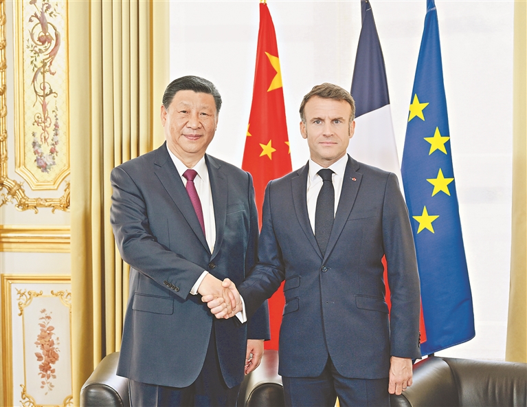 马克龙表示,今年法中将共同隆重庆祝法中建交60周年。法中关系友好,合作富有成效,不仅涉及高尖端技术,也包括气候变化、海洋多样性等全球性议题。习近平主席访问期间,双方签署多项合作协议,再次彰显法中合作的潜力和前景。当前,世界面临诸多紧迫挑战,法中关系处于承前启后的关键时刻。法中关系具有深厚底蕴,双方相互尊重,着眼长远,加强合作,将为解决全球性挑战、避免集团对立对抗发挥重要积极作用。法方希望同中方进一步密切双边经济关系和多边沟通协作,推动法中战略伙伴关系取得更多成果。法方希望向中国出口更多农产品,同时将对中国保持市场开放,不会针对中国企业搞歧视性政策,欢迎更多中国企业包括高技术企业赴法投资合作。法方愿同中方加强航天航空、民用核能等领域合作,共同办好今年法中文化旅游年活动,欢迎中方派团出席巴黎奥运会。法方愿就气候变化、生物多样性保护、人工智能等全球性问题同中方密切沟通合作,共同维护多边主义、联合国宪章宗旨和国际法。