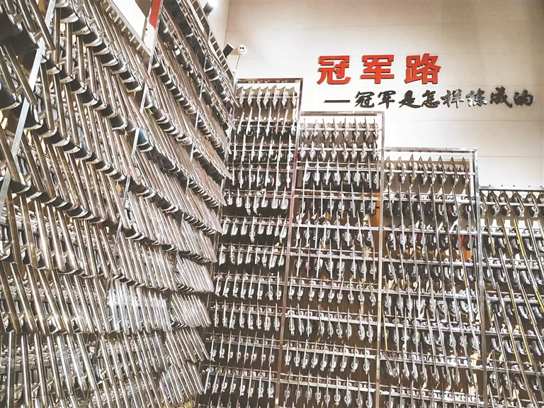 冠军馆中“冠军路”板块由冠军穿过的冰鞋排成了冰鞋墙。